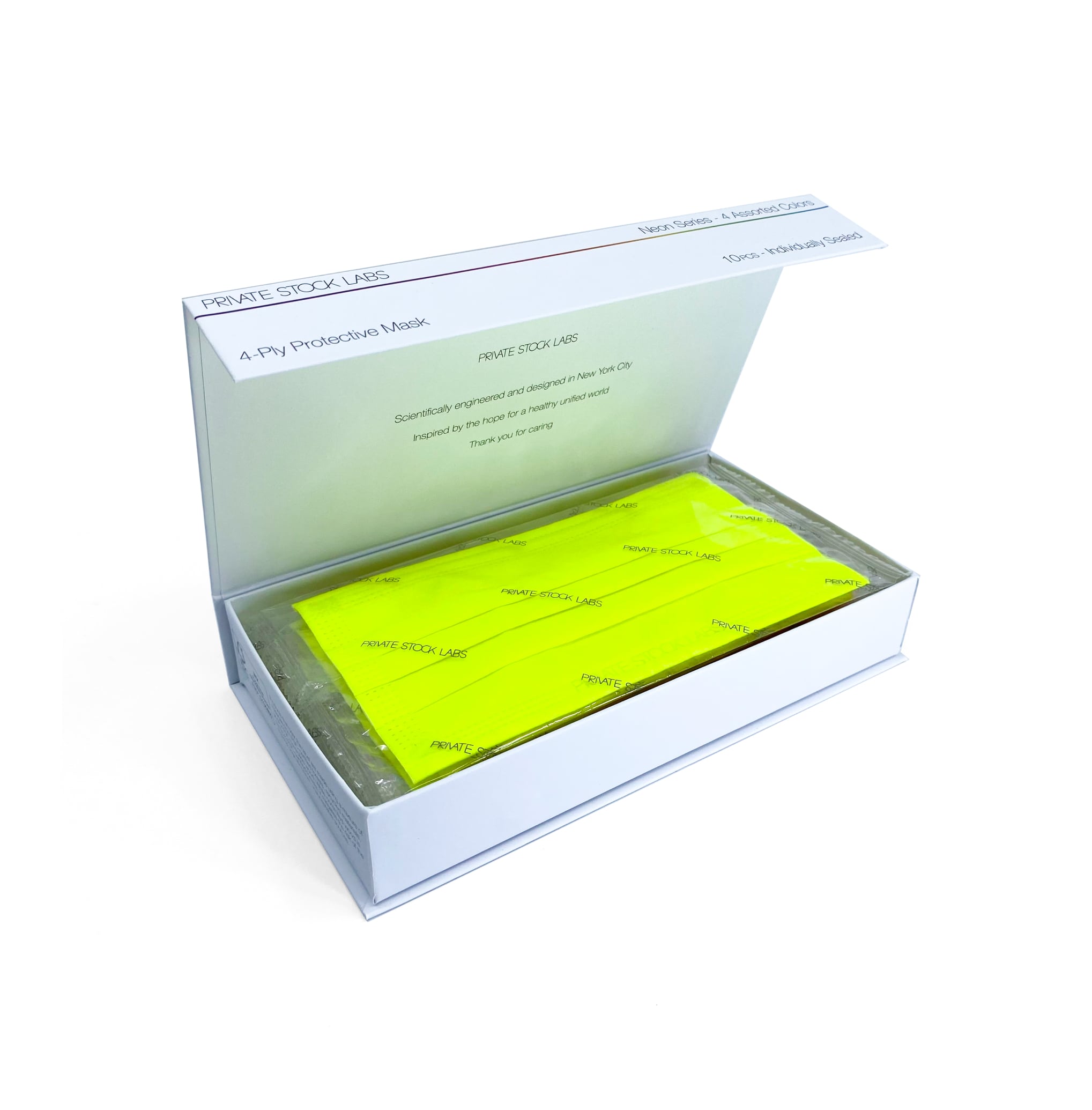 Ten masks per box. Each mask is individually sealed with BOPP film to ensure cleanliness.